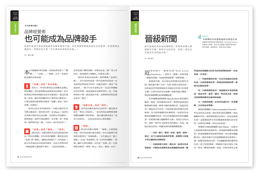 《動腦》多元豐富的產(chǎn)品除雜志外,另有Brain.com數(shù)數(shù)位平臺、動腦講座、及動腦俱樂部、叢書出版、動腦考察團及廣告獎,滿足讀者各項需求。,廣告行銷媒體圈瞭望者的角色;讀者涵蓋臺、中、港、新、馬、美國等地華文廣告界。