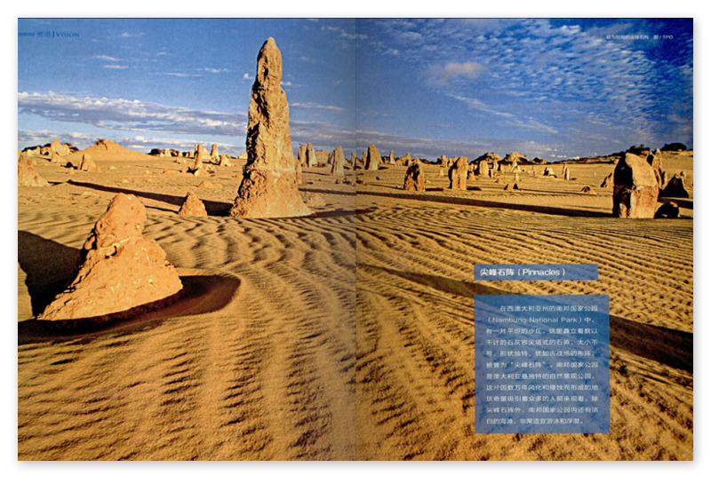 峰石陣,在西澳大利亞州的南邦國家公園中,有一片平坦的沙丘,這里矗立著數(shù)以干計(jì)的石灰?guī)r尖塔式的石筍,大小不等,形狀獨(dú)特,猶如古戰(zhàn)場的布陣,被譽(yù)為“尖峰石陣南邦國家公園是澳大利亞獨(dú)特的自然景觀公園,這片因數(shù)萬年風(fēng)化和侵蝕而形成的地質(zhì)奇景吸引著眾多的人前來觀看。