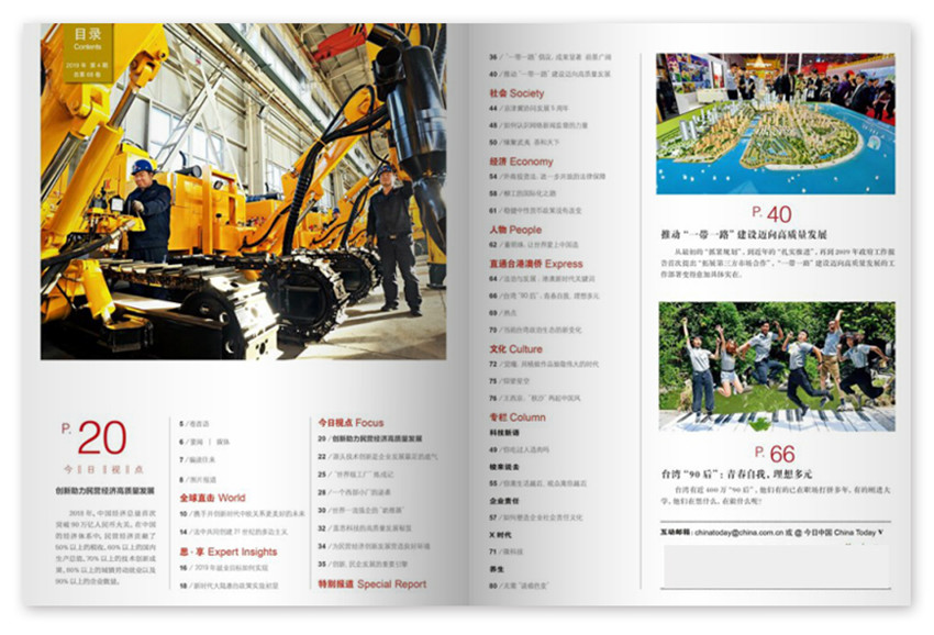 《今日中國》雜志,(月刊),是面向全國發(fā)行的外語類期刊,雜志擁有獨(dú)到的思維與敏銳的眼光,使得雜志成為眾多國際大品牌客戶重視的核心媒體之一。從生活入手,以民間身份、及時、深度地報(bào)道當(dāng)代中國的經(jīng)濟(jì)文化社會現(xiàn)象。它在臺港澳人士及大陸讀者中享有較高的聲譽(yù),積極溝通兩岸四地之間的信息、增進(jìn)交流、了解與親情,主要讀者對象為投資、工作、學(xué)習(xí)、生活的臺港澳人士為主,兼顧世界各地的華人華僑。