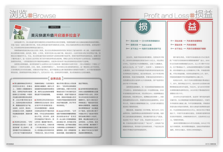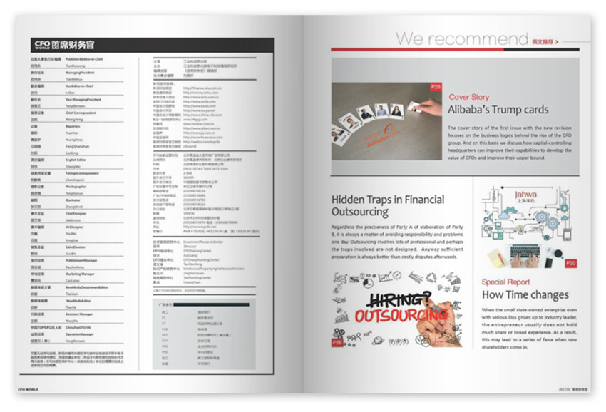 《首席財(cái)務(wù)官》主要欄目:編者的話、瀏覽、損益、特別報(bào)道、金融前瞻、財(cái)資天下、資本運(yùn)作、投資者關(guān)系、銀企互聯(lián)、風(fēng)險(xiǎn)管理、企業(yè)社會(huì)責(zé)任、CFO實(shí)戰(zhàn)、職場(chǎng)、稅務(wù)。