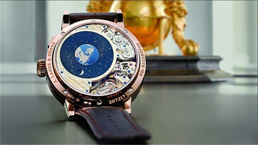 月球裝置顯示裝飾華麗,不僅呈現(xiàn)當前的月相,更展現(xiàn)月球對應太陽的位置及在夜空中運行的軌跡。RICHARDLANGEPERPETUALCALENDAR“Terraluna”的專利軌跡月相顯示同樣是精密制表領域的創(chuàng)新杰作。此無比的裝置,描繪月球對應地球和太陽的不斷變化的位置關系。