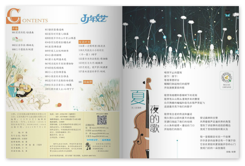 《少年文藝》創(chuàng)辦于1976年,月刊,單期96頁,《少年文藝》是一本以青少年為讀者對象的文藝類刊物,以“文學(xué)少年的知音,陶冶性情的藝苑,作文入門的向?qū)В磥碜骷业膿u籃”為辦刊宗旨,陪伴并見證了一代又一代少年的成長,系中國期刊方陣成員,江蘇省雙效期刊,三次蟬聯(lián)中國優(yōu)秀少兒報刊獎金獎。