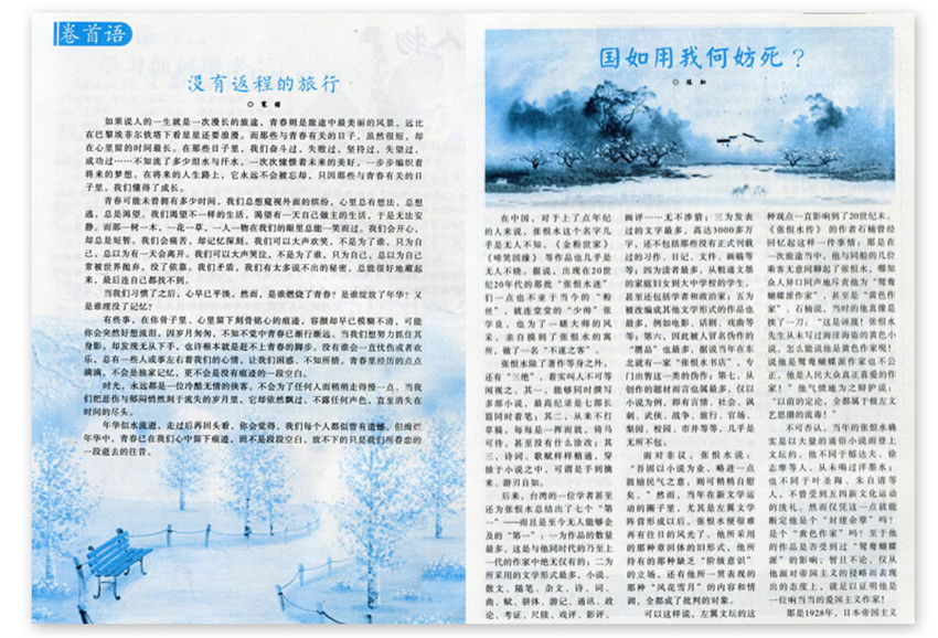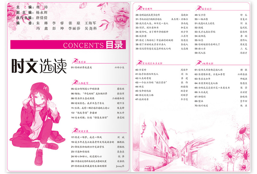 《時文選讀》主要欄目:心靈的觸動、有力的肩膀、七彩的人生、信仰的堅守、歷史的星空、鄉(xiāng)愁的滋味、自然的啟示、人性的光輝、生活的波瀾、飛揚的青春等。