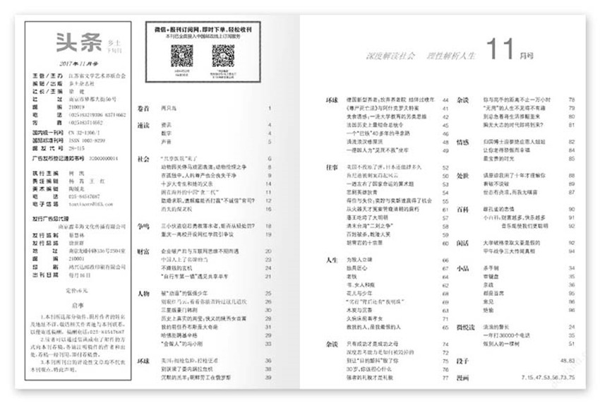 《鄉(xiāng)土·頭條》雜志每期從1萬余種書報刊中精選文章,對當前的熱點事件進行深度披露,對各類社會現(xiàn)象展開多角度探析,對新鮮觀點與爭鳴作系統(tǒng)介紹,對紛繁復雜的人生作哲理性思考。雜志內容涉及社會、人生、人物、文史、海外等各類經(jīng)典文章,傳遞有關為人、立世、創(chuàng)業(yè)、發(fā)展的不朽價值,是你行走社會的生存讀本。