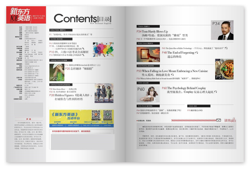 《新東方英語(yǔ)》雜志主要內(nèi)容為實(shí)用的考試技巧輔導(dǎo)、的留學(xué)資訊、系統(tǒng)的異域文化介紹以及雋永的美文賞析。