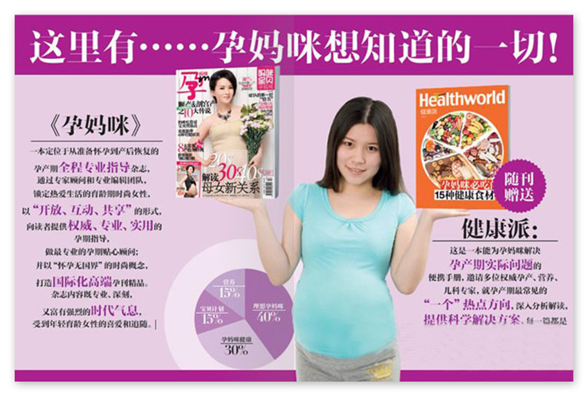 《孕媽咪》雜志鎖定熱愛生活的育齡期時尚女性,以“開放、互動、共享”的形式,向讀者提供、專業(yè)、實用的孕期指導(dǎo),做最專業(yè)的孕期貼心顧問;并以“懷孕無國界”的時尚概念,打造國際化高端孕刊精品。雜志內(nèi)容既專業(yè)、深刻,又富有強烈的時代氣息,受到年輕育齡女性的喜愛和追隨。