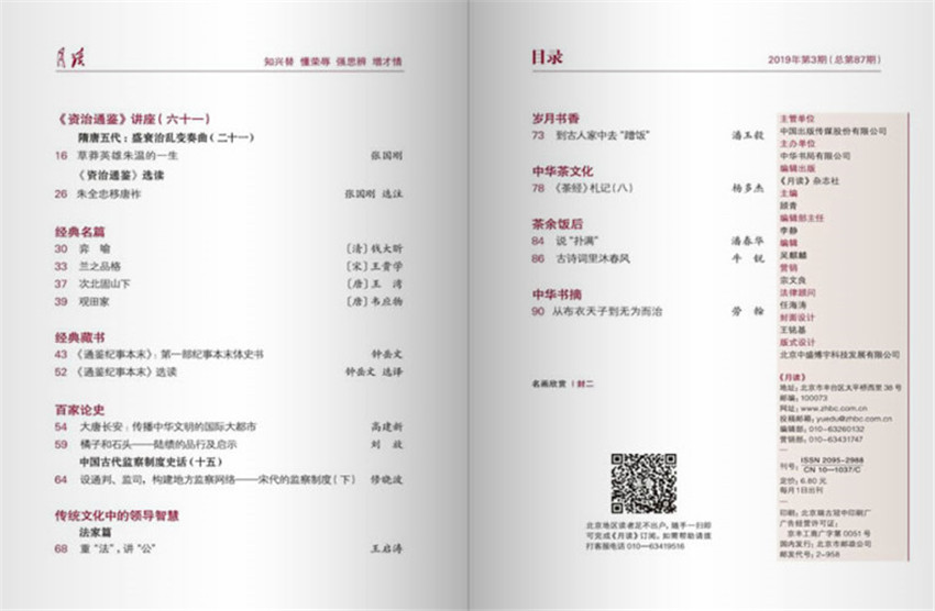 《月讀》主要欄目:中國象征、特別關(guān)注、鑒古知今、資政通鑒、名句選粹、經(jīng)典名篇、名家論史、跟古人學(xué)哲學(xué)、茶余飯后、隨感札記。