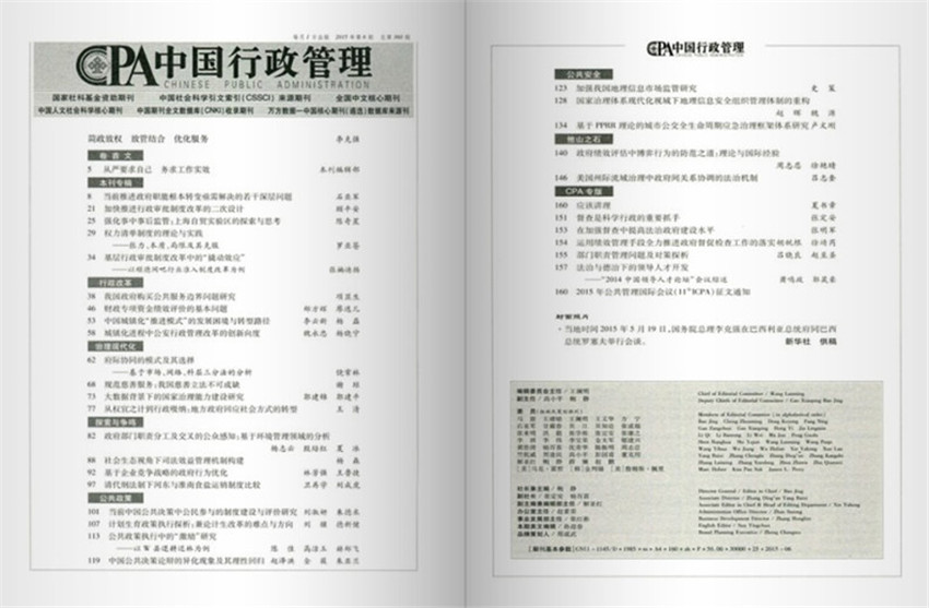 《中國行政管理》雜志是由國務(wù)院辦公廳主管,中國行政管理學(xué)會主辦,是新中國成立后創(chuàng)辦的第一本研究行政管理的專業(yè)刊物,是反映政府行政管理理論與實踐的北大圖書館收錄期刊,也是目前我國行政(公共)管理學(xué)科大型綜合性期刊,被北大圖書館收錄期刊要目總覽列為“政治學(xué)類”第一位、“管理學(xué)類”第一位。2012年入選國家社科基金學(xué)術(shù)期刊首批資助名單(批準(zhǔn)號12QKA095)。