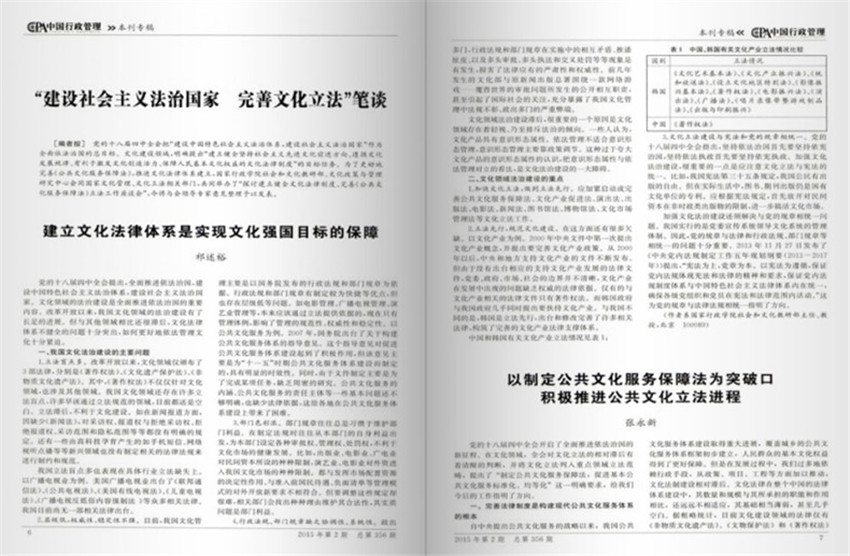 建設(shè)社會主義法治國家、完善文化立法”筆談,黨的十八屆四中全會把“建設(shè)中國特色社會主義法治體系,建設(shè)社會主義法治國家”作為依法治國的總目標(biāo)。文化建設(shè)領(lǐng)域,明確提出“建立健全堅持社會主義先進文化前進方向、遵循文化發(fā)展規(guī)律、有利于激發(fā)文化創(chuàng)造活力、保障人民基本文化權(quán)益的文化法律制度”的目標(biāo)任務(wù)。為了更好地完善《公共文化服務(wù)保障法》,推進文化法律體系建立,國家行政學(xué)院社會和文化教研部、文化政策與管理研究中心會同國家文化管理、文化立法相關(guān)部門,共同舉辦了“探討建立健全文化法律制度。