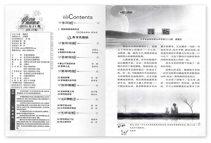 提倡“說真話,做真人”為辦刊宗旨,故深受中學(xué)師生歡迎,主要欄目:金素材、時文素材、名校作文、作文講堂、在路上、作文素材實(shí)戰(zhàn)點(diǎn)擊、滿分作文讀解、新格言等。